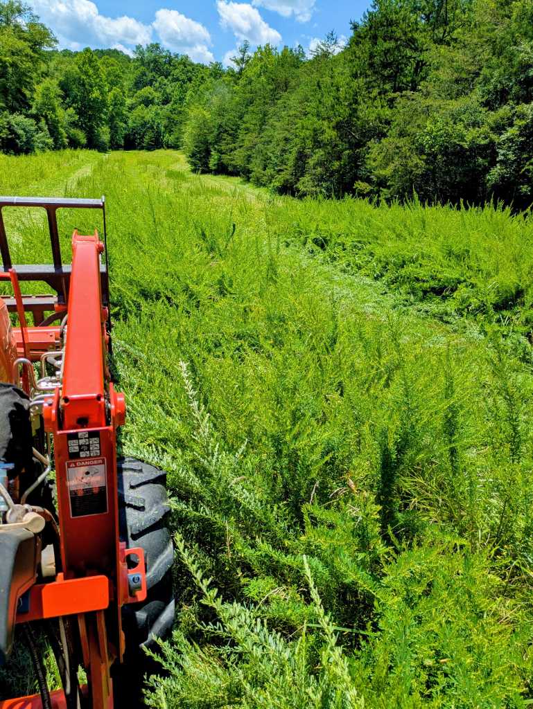 We are commited to not using herbicidals, so our plan is to mow the highly infested fields every 4-6 weeks from June-Oct for the next couple years, and allow native seedling trees that have taken root in the fields (mostly sycamores, tulip poplars, and persimmons), and Keystone & Beneficial plants to grow. We are currently researching additional natural methods to assist native plants in outcompeting the invasives.